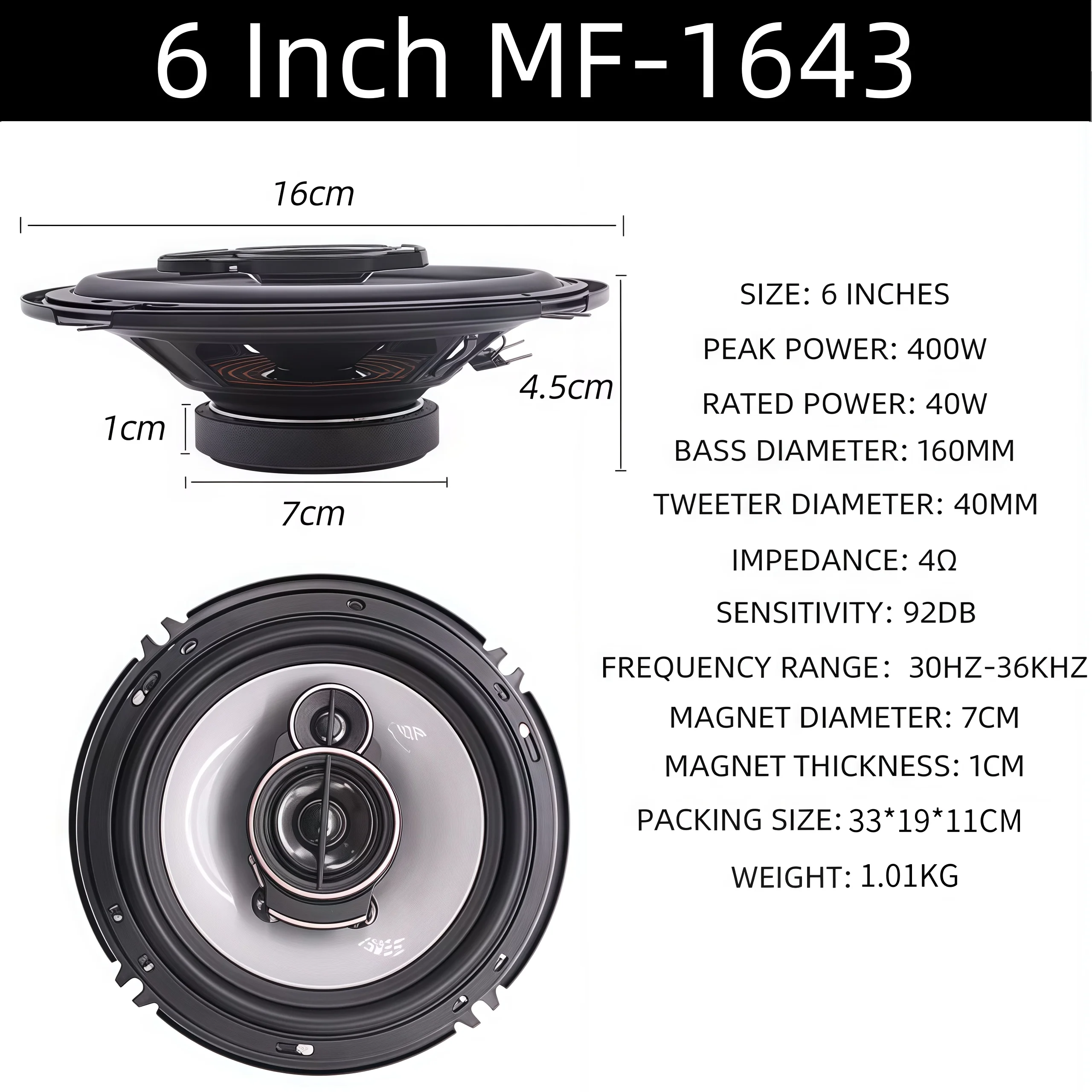 En Zona Tendencias elevamos el estándar de tu audio con el modelo MF1643. Estos parlantes de 6 pulgadas no son cornetas convencionales; son un sistema coaxial de 3 vías con una potencia máxima de 400W, diseñados para reproducir desde los bajos más profundos (30Hz) hasta los agudos más cristalinos. Su alta sensibilidad de 92dB garantiza un sonido fuerte y claro sin distorsión.