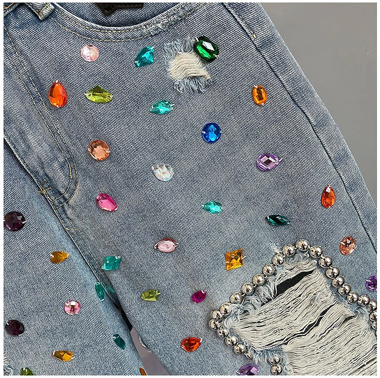 A pesar de su apariencia robusta, este modelo está fabricado con una mezcla premium de algodón y poliéster que incluye Slight Stretch (ligera elasticidad). Esto garantiza que el pantalón se adapte a tus movimientos sin deformarse. Además, el proceso de Light Wash (lavado azul claro) no solo suaviza la fibra para un tacto agradable sobre la piel, sino que también realza los tonos de los cristales decorativos. Para quienes buscan un estilo similar pero en versión larga, nuestros Jeans Wide Leg con Diamantes son la opción ideal para las noches de verano.