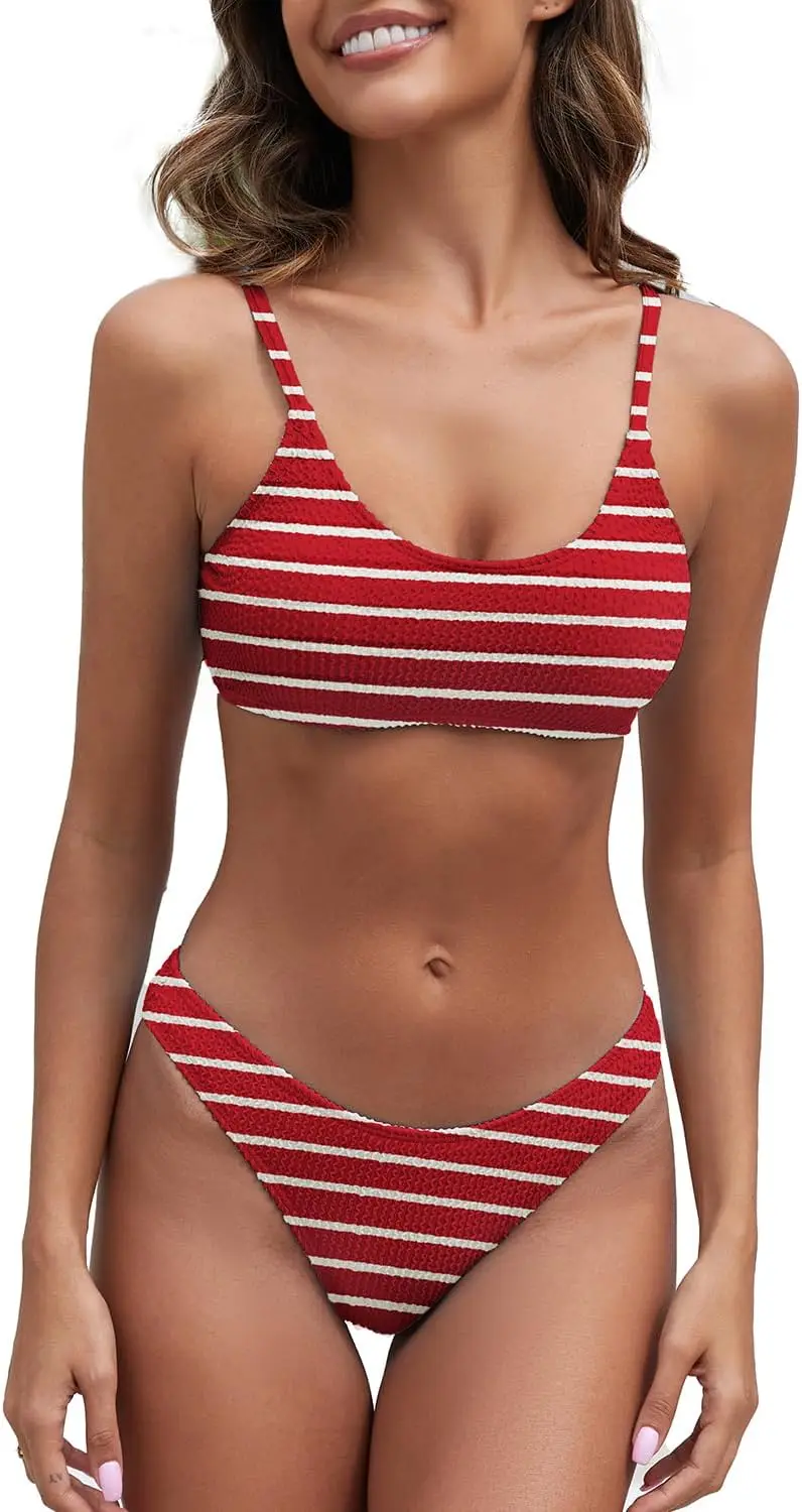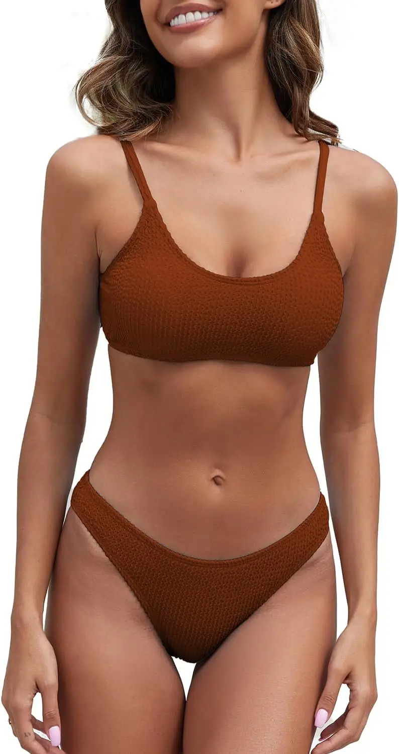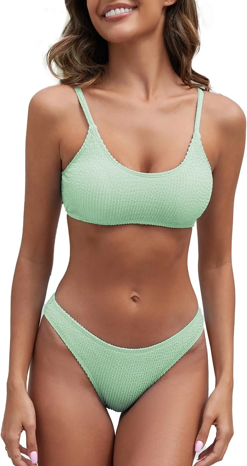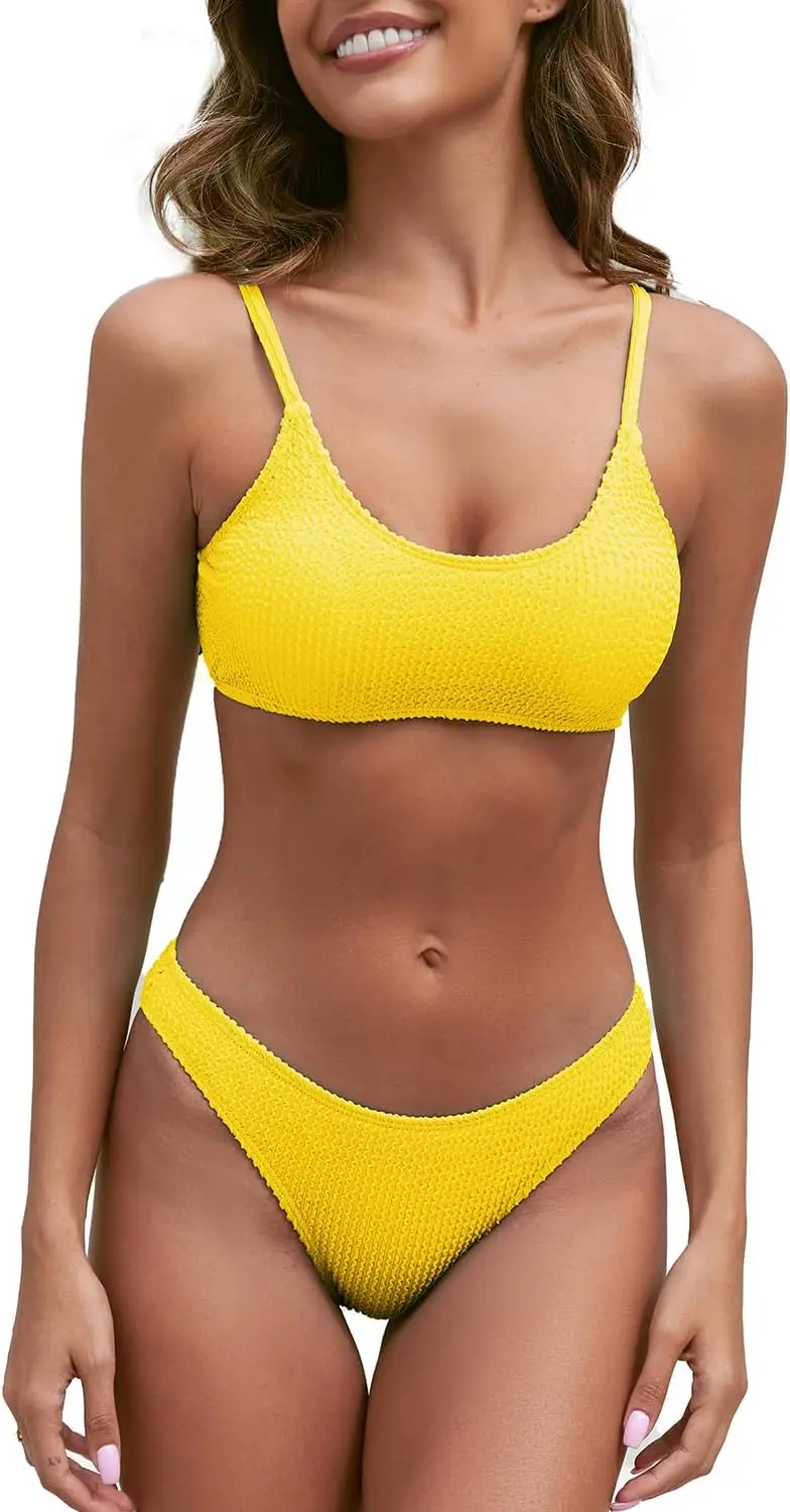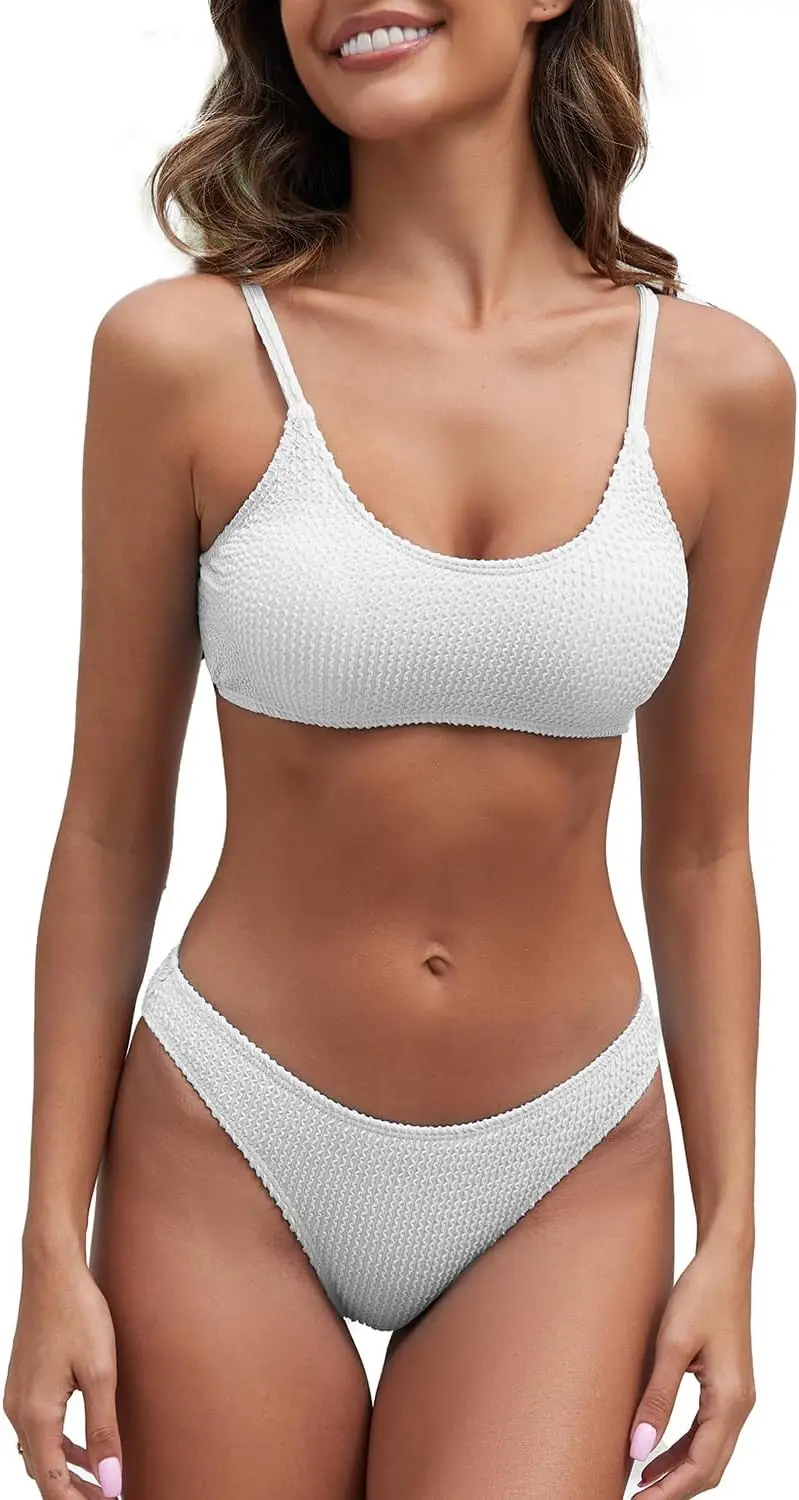 Lo que realmente define y hace destacar a este Bikini es su sistema de sujeción de alta ingeniería. A diferencia de los tops convencionales de tela simple, este diseño integra copas con refuerzo metálico que proporcionan una elevación natural y una firmeza inigualable durante todo el día. El escote tipo Scoop Neck combinado con el acabado texturizado añade un toque deportivo y juvenil, ideal para las mujeres que buscan funcionalidad sin perder la estética actual.