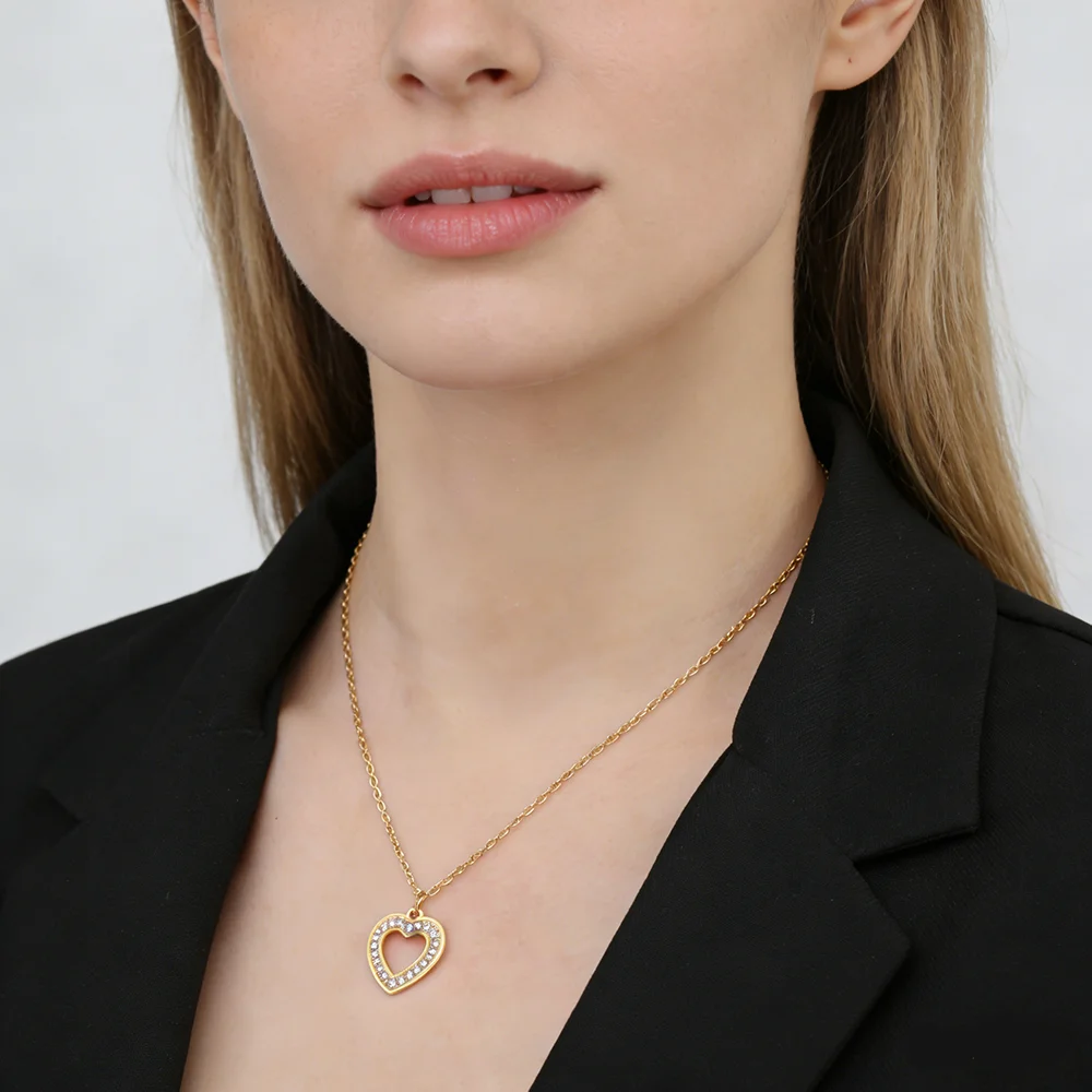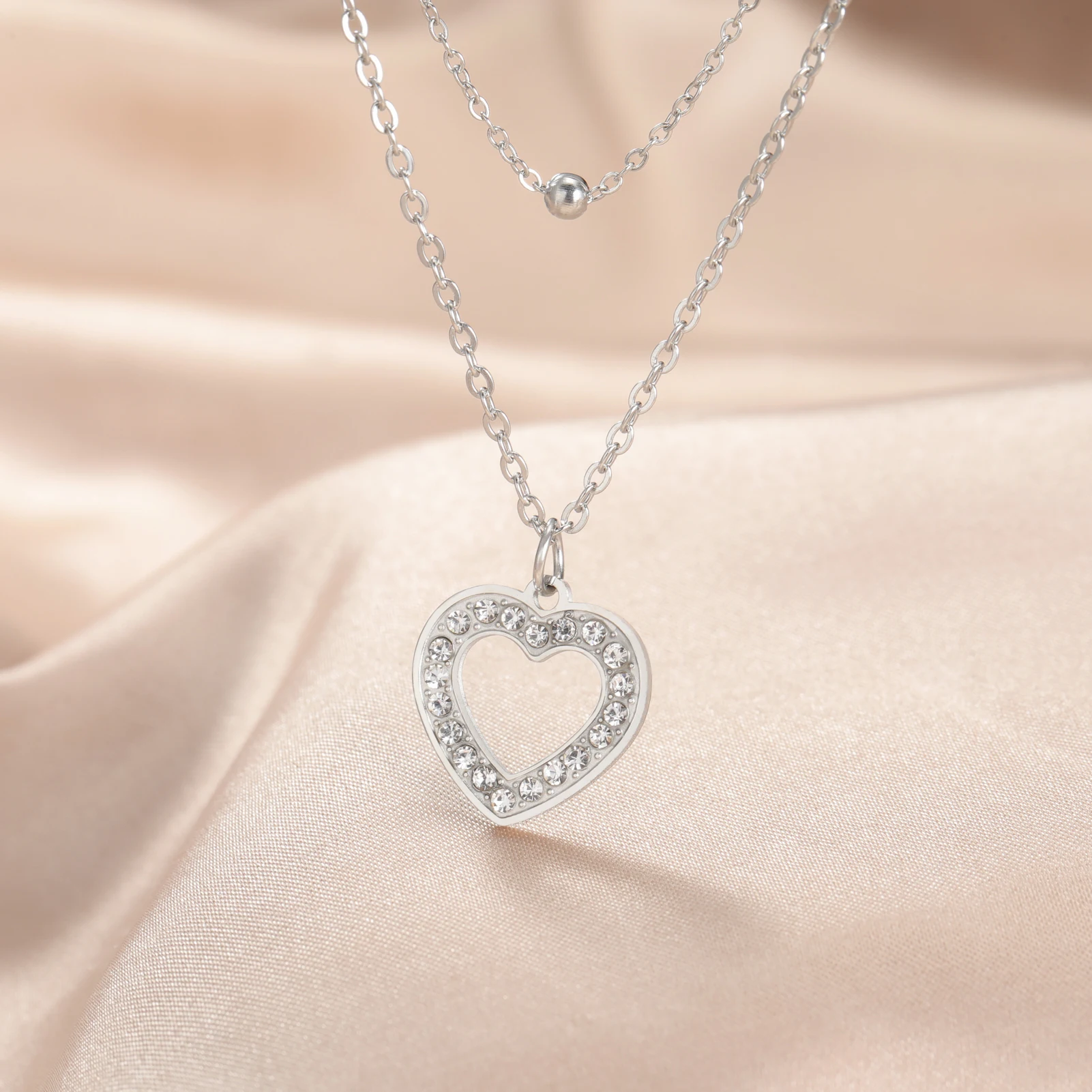 Lo que hace único a este Collar de Corazón con Brillantes es su estructura de doble nivel. La primera cadena descansa delicadamente sobre la base del cuello, mientras que la segunda desciende para sostener el dije principal: un corazón geométrico adornado con zircones que capturan la luz desde cualquier ángulo. Al elegir un Collar de Corazón con Brillantes con este diseño, evitas el problema común de que las cadenas se enreden entre sí, ya que ambas están unidas estratégicamente para mantener su posición perfecta.