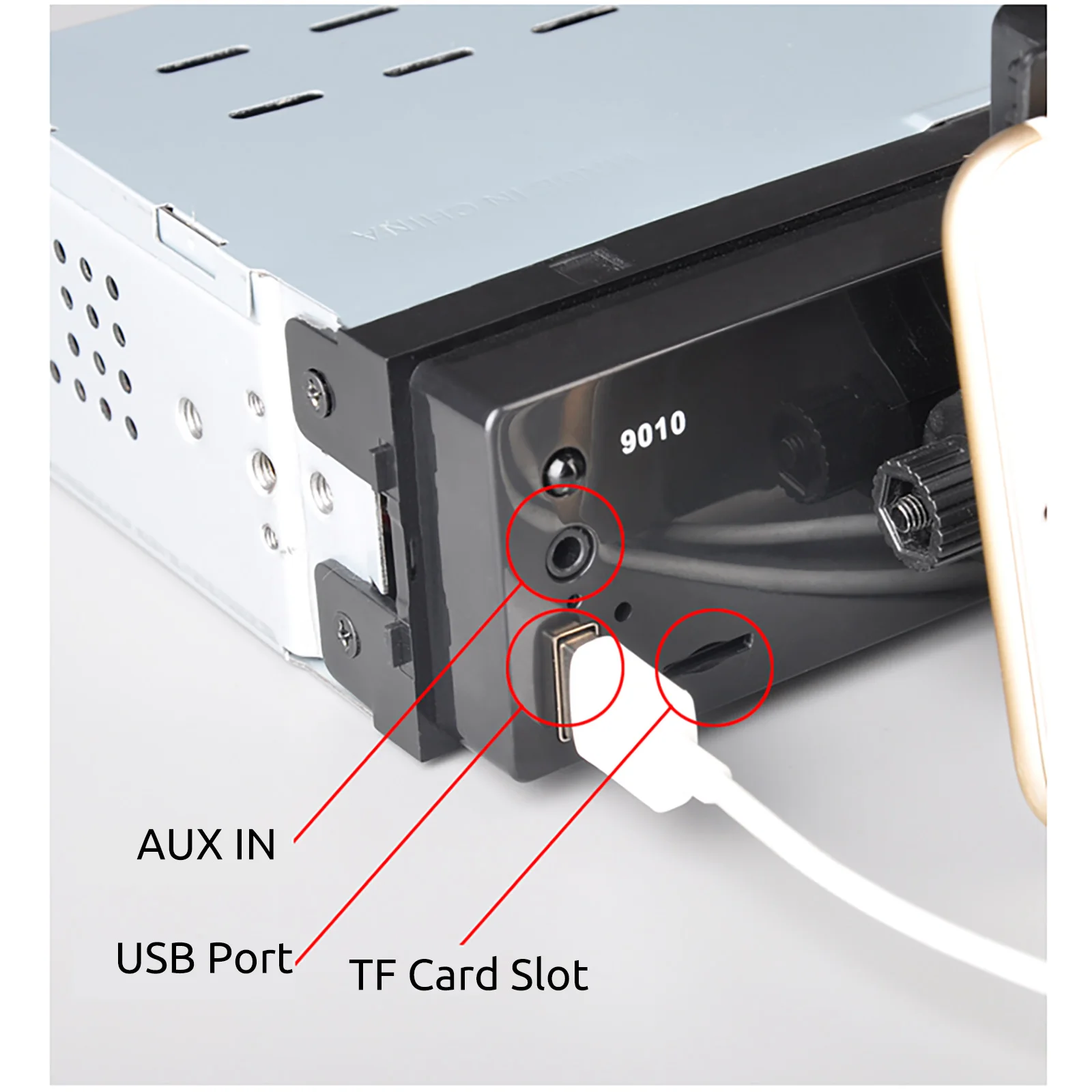 Múltiples Puertos: Entradas frontales para USB, AUX y tarjeta Micro SD (TF Slot).