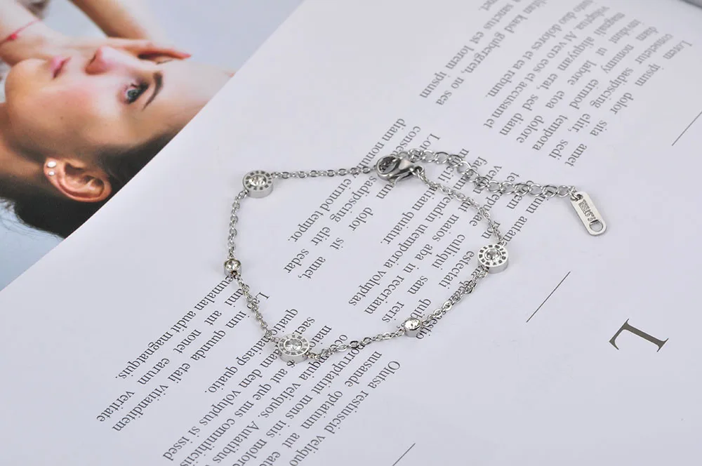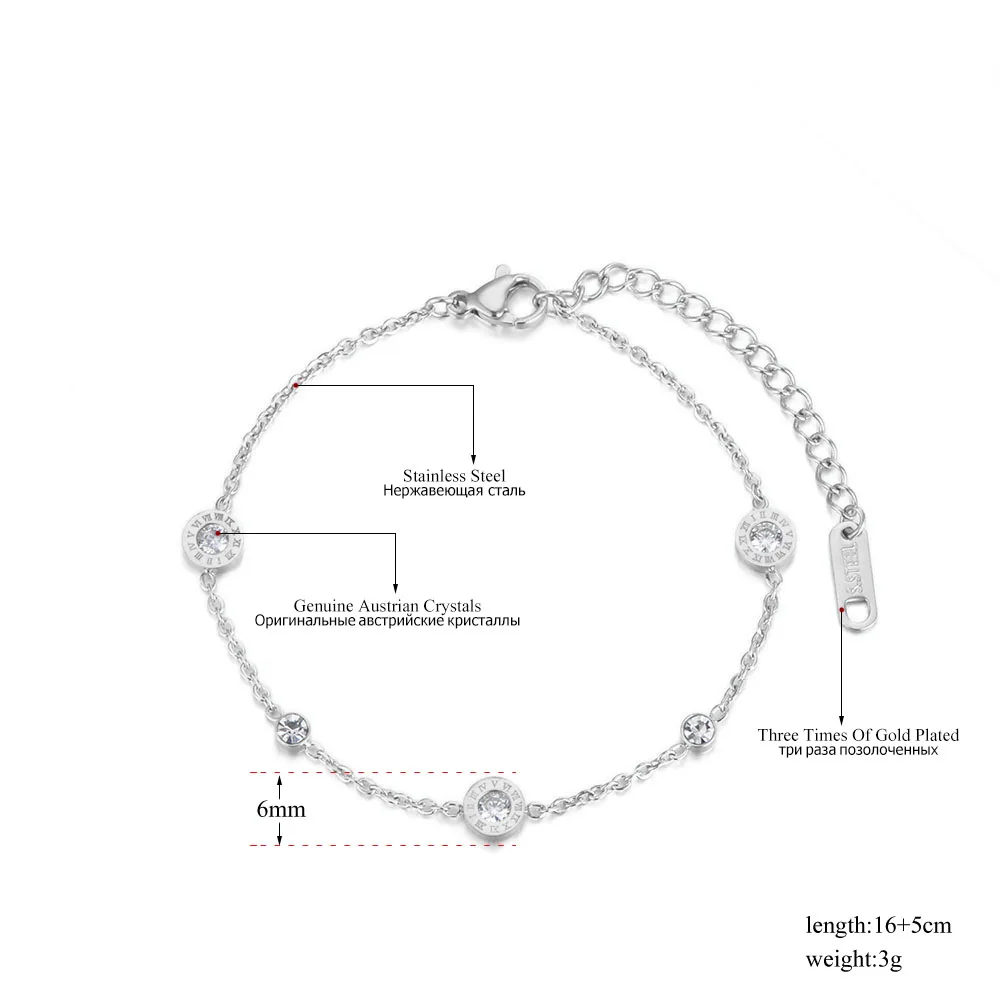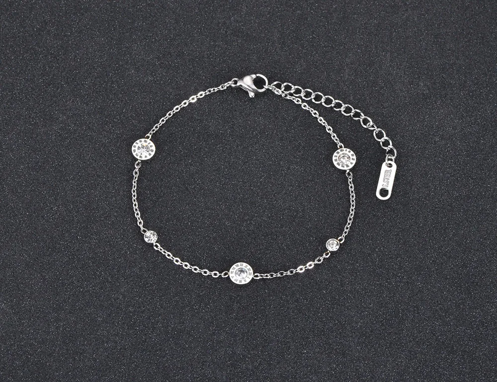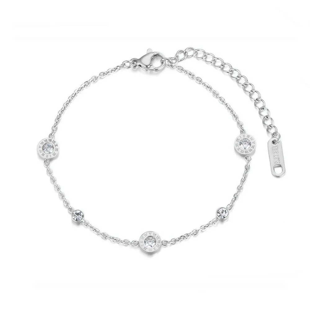 El elemento central de esta pulsera de acero inoxidable es su amuleto circular calado con números romanos, un símbolo de eternidad y sofisticación. En el corazón de la pieza, se encuentra una gema de circonia cúbica de grado AAA, engastada mediante tensión (Tension Setting) para maximizar la entrada de luz y potenciar su brillo natural. Esta combinación de geometría y destellos convierte al brazalete de números romanos en una opción ideal para eventos formales y uso diario.