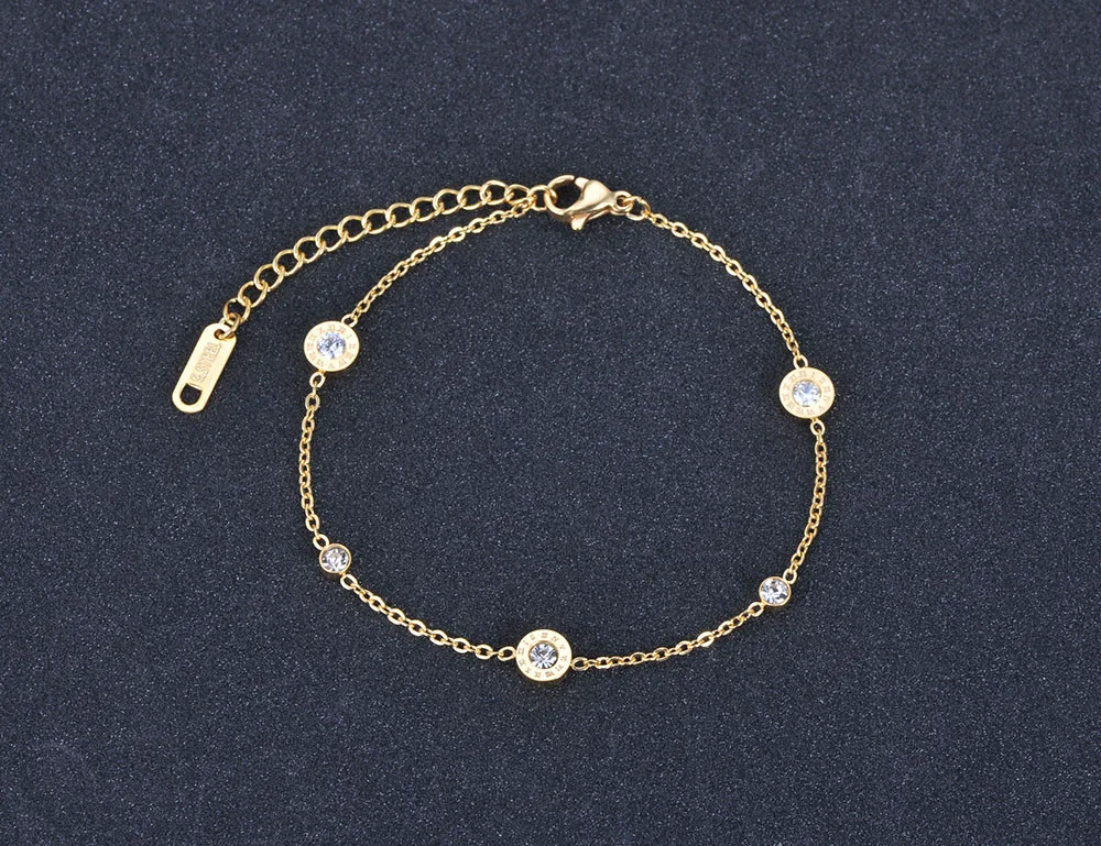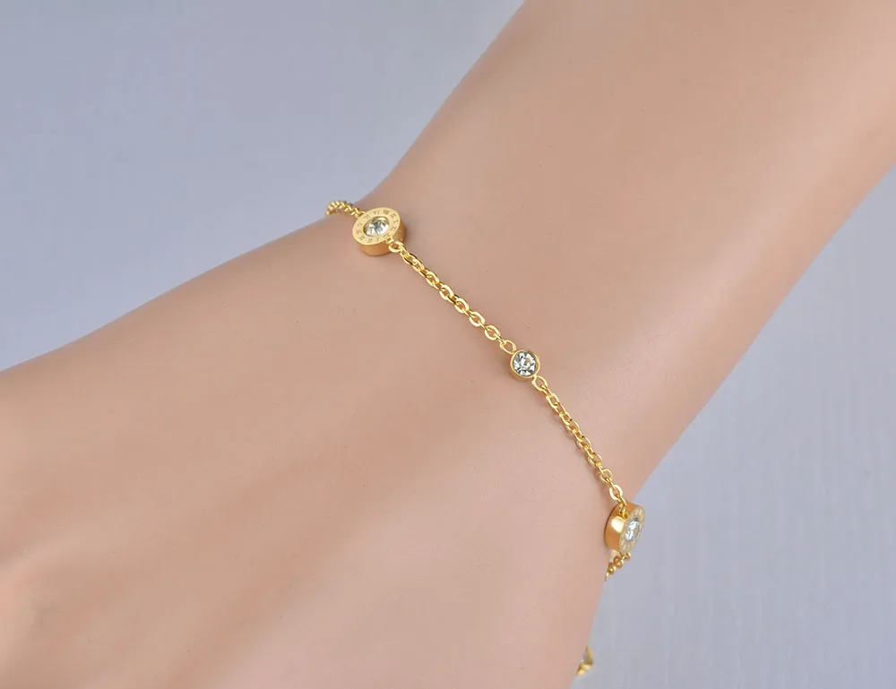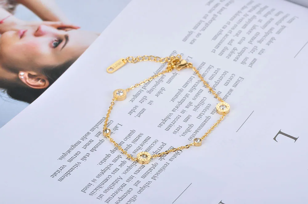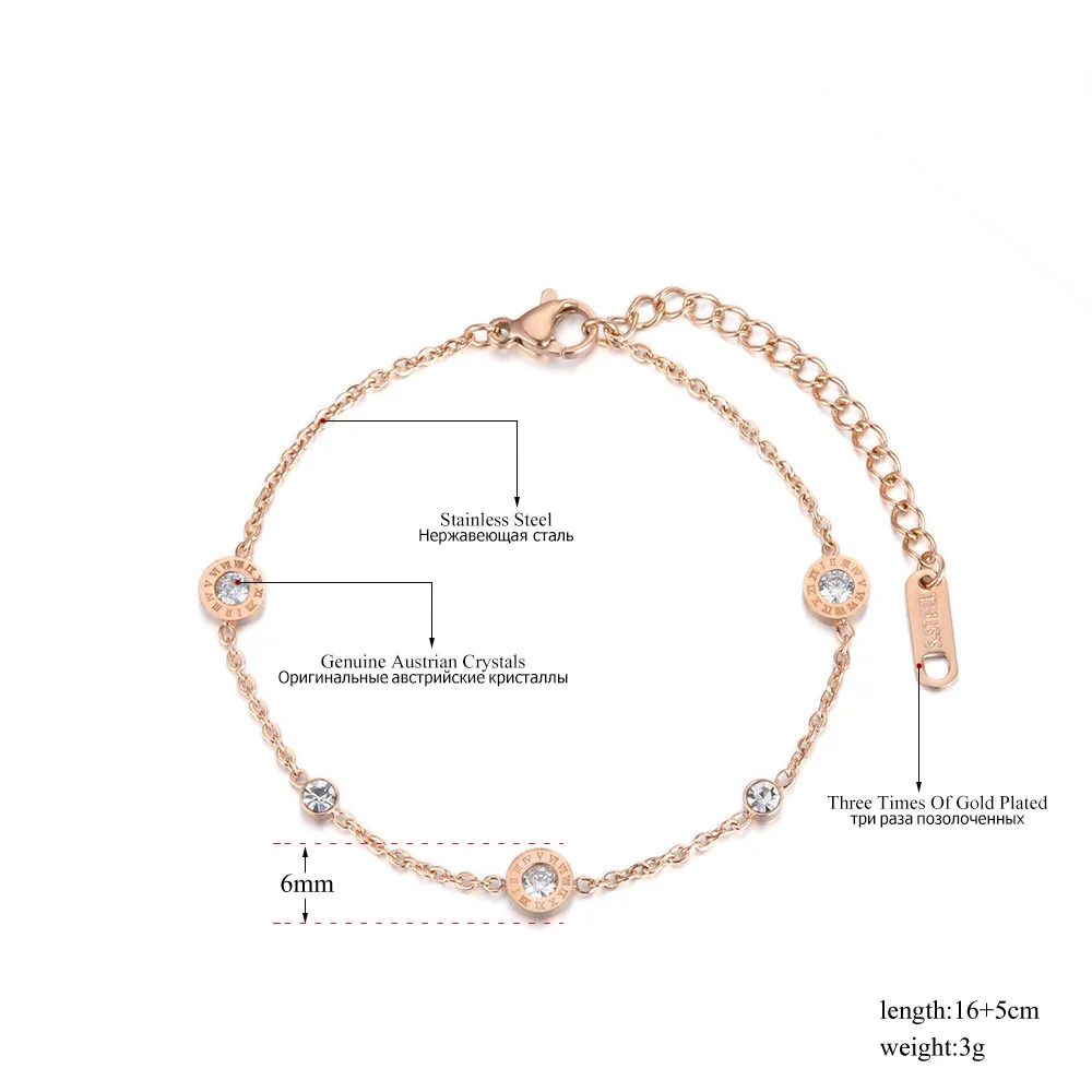 El elemento central de esta pulsera de acero inoxidable es su amuleto circular calado con números romanos, un símbolo de eternidad y sofisticación. En el corazón de la pieza, se encuentra una gema de circonia cúbica de grado AAA, engastada mediante tensión (Tension Setting) para maximizar la entrada de luz y potenciar su brillo natural. Esta combinación de geometría y destellos convierte al brazalete de números romanos en una opción ideal para eventos formales y uso diario.