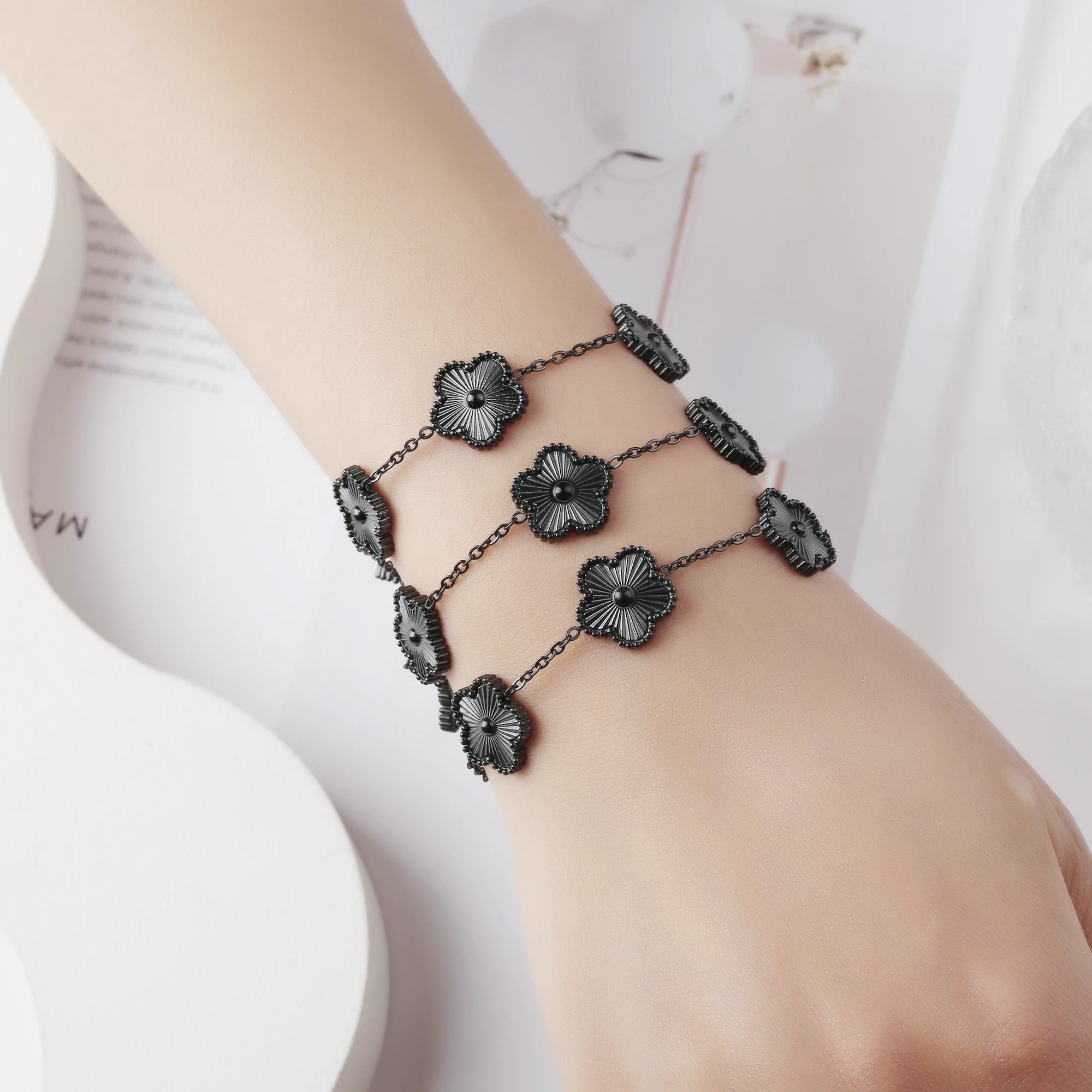 Pulsera de trébol negro y flores: Elegancia floral en acero