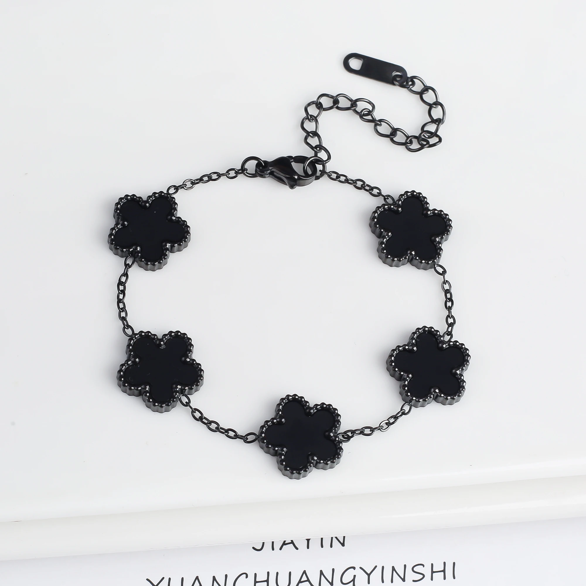 La combinación entre una pulsera de trébol negro y un diseño de flores de cinco pétalos representa la máxima expresión del «Light Luxury» en la joyería contemporánea. Este accesorio ha sido diseñado meticulosamente para la mujer que desea una joya sutil pero de gran impacto visual, capaz de elevar cualquier atuendo, desde un look de oficina hasta un vestido de gala. Inspirada en los jardines de alta costura, esta pieza combina la resistencia de los metales modernos con la delicadeza de los detalles en acrílico.